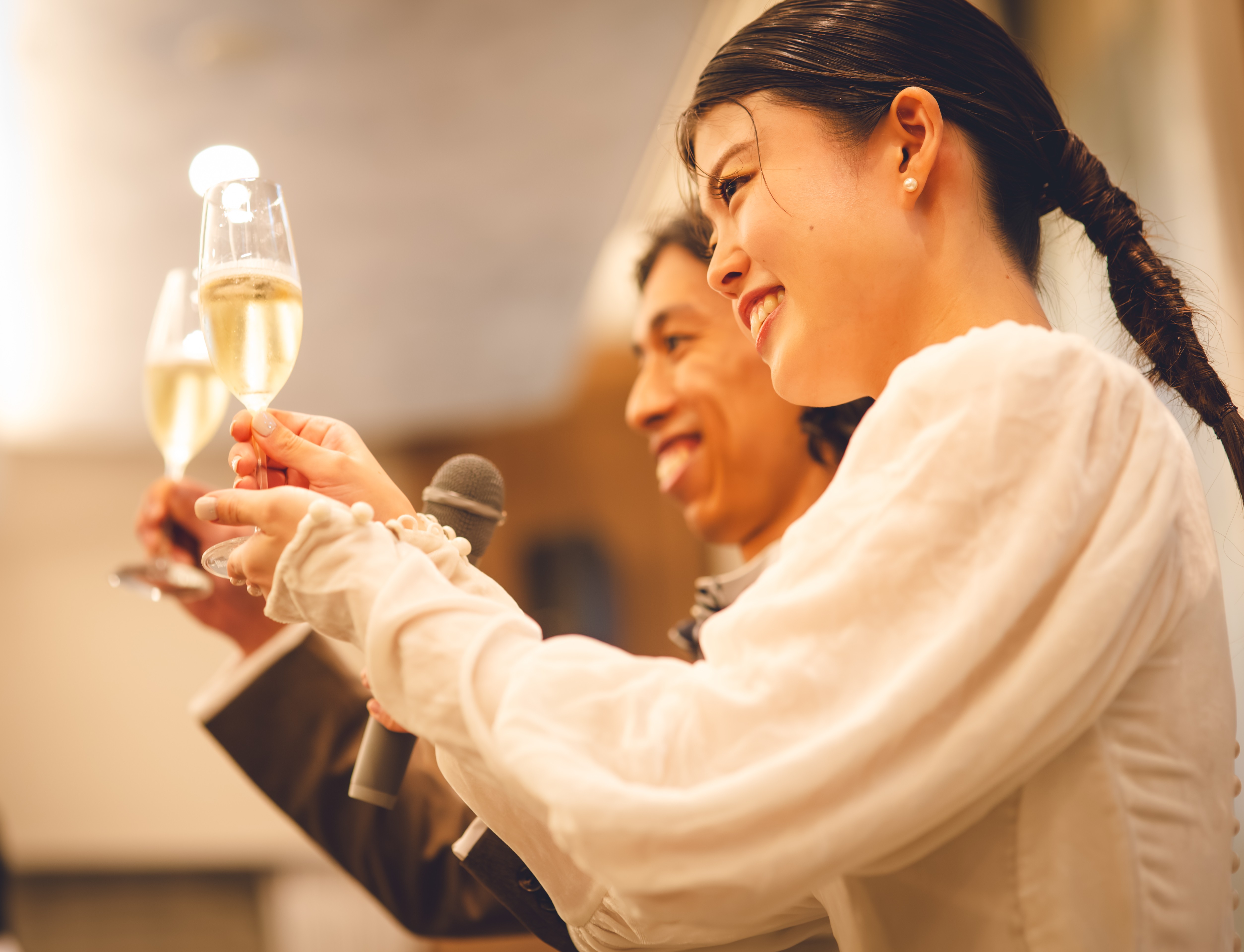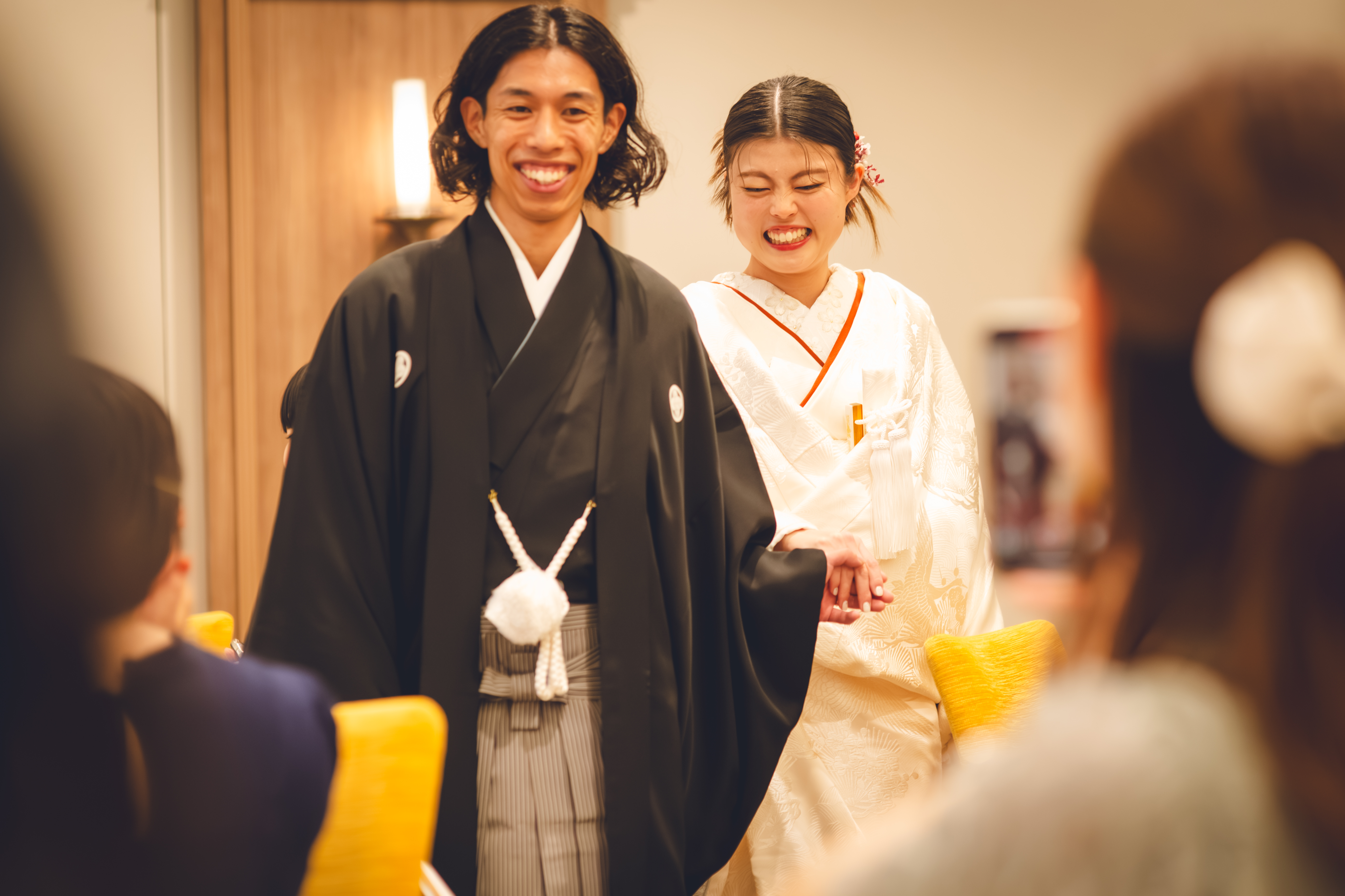 高砂にテーブルを置かなかったことで参列者との距離が近く、披露宴中にたくさんお話ができて嬉しかったです。新郎新婦の周りで動きをサポートしていただいたり、衣装の調整をしていただいたりして、安心して披露宴を楽しむことができました。当日天候も不安定でしたがプランナーさん含め、ギリギリまで私たちの希望通りに進められるようご尽力いただきました。おかげさまで忘れられない1日となりました。