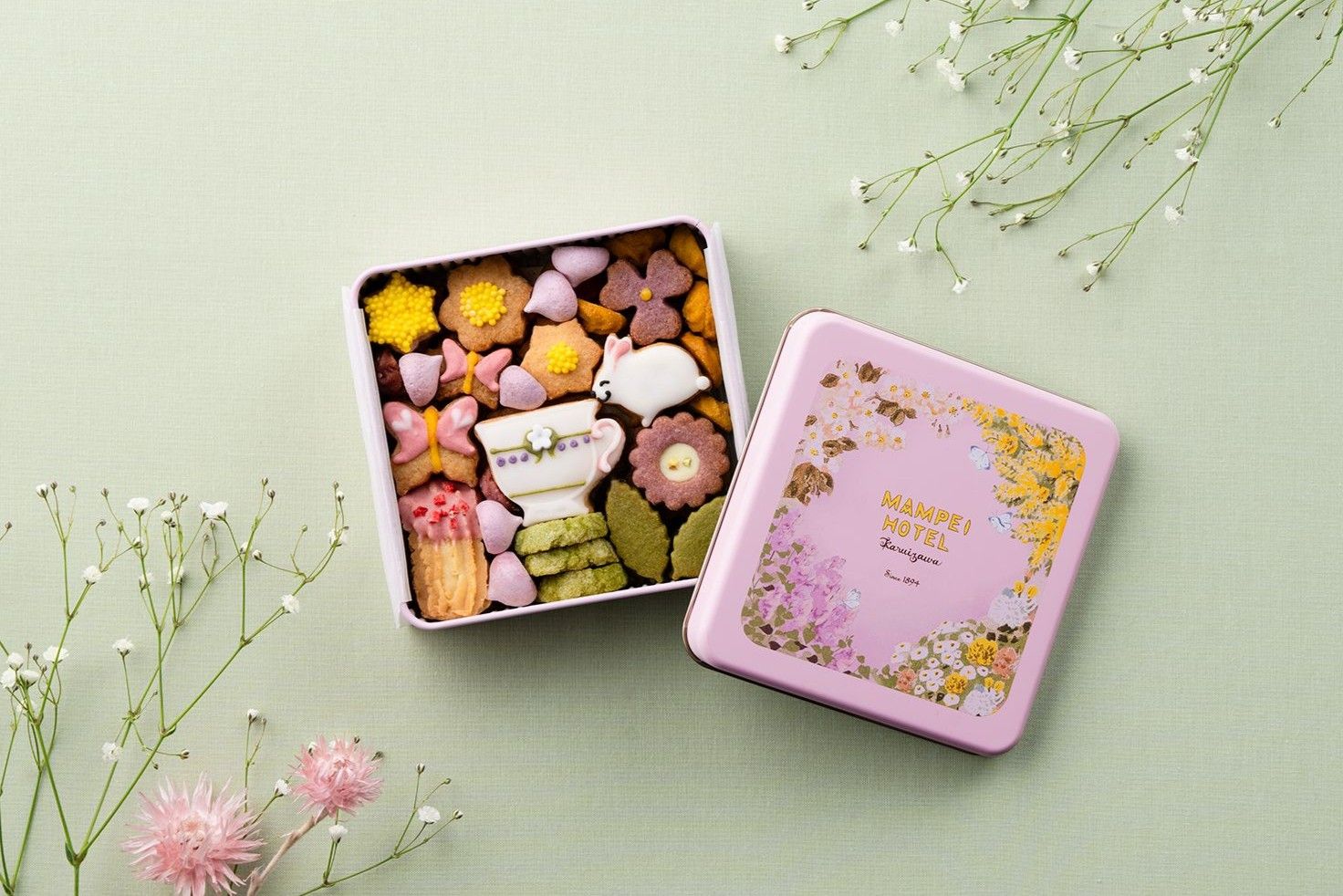 「万平ホテルフラワークッキー缶」シリーズ第3弾として、春めく「カフェテラス」を表現した新作が登場。春の陽気に誘われて集まってきたうさぎや蝶々を描いたアイシングクッキーや、その周りに咲く花々をデザインしたクッキーを詰め合わせました。