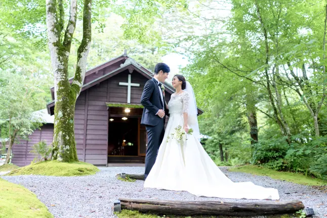 カトリック軽井沢 聖パウロ教会は1935年、イギリス人司祭ウォード神父によって建てられました。三角屋根と大きな尖塔は軽井沢のシンボル的存在です。信徒でなくても、カトリック教に則った式を挙げることができ、お式が終わった後も縁をもち、再び訪れることができるのは本物の教会ならではです。厳かでありながら温かな挙式が執り行われます。